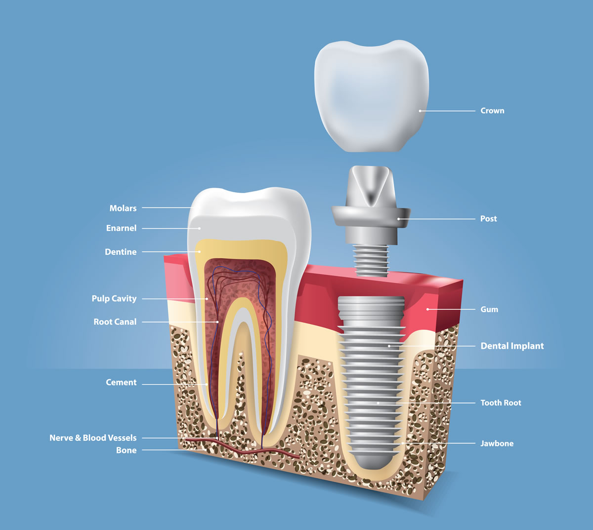 O implante dentário é uma estrutura de titânio, que funciona como uma raiz artificial e é colocada no osso maxilar ou mandibular, no local onde havia o dente perdido.